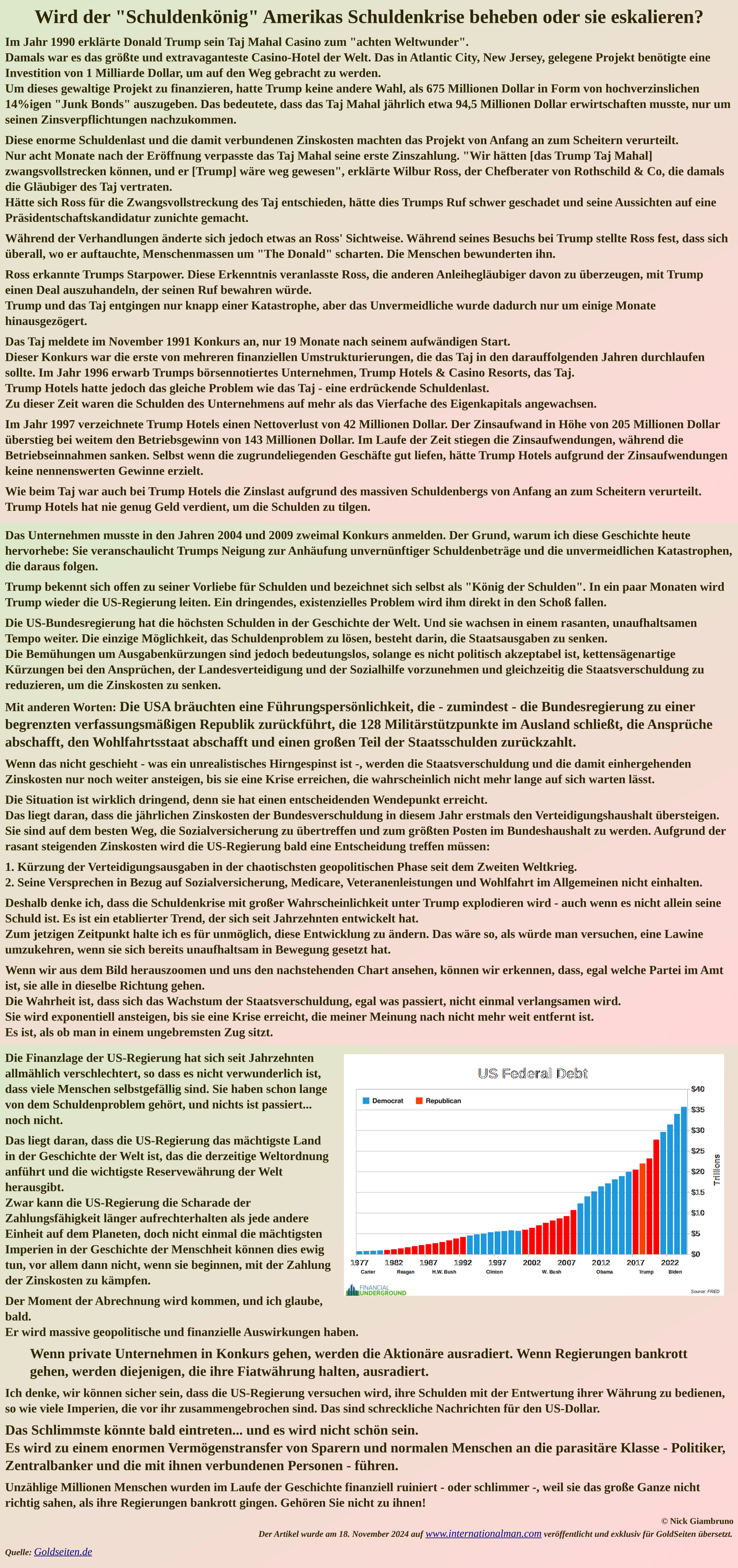 Schulden-über-Schulden Quelle der Infos: telegram/Links/YT fINANZEN-WÄHRUNGEN Wird der „Schuldenkönig“ Amerikas Schuldenkrise beheben oder sie eskalieren?© Nick Giambruno – Der Artikel wurde am 18. November 2024 auf www.internationalman.com veröffentlicht und exklusiv für GoldSeiten übersetzt. – Quelle: Goldseiten.de
