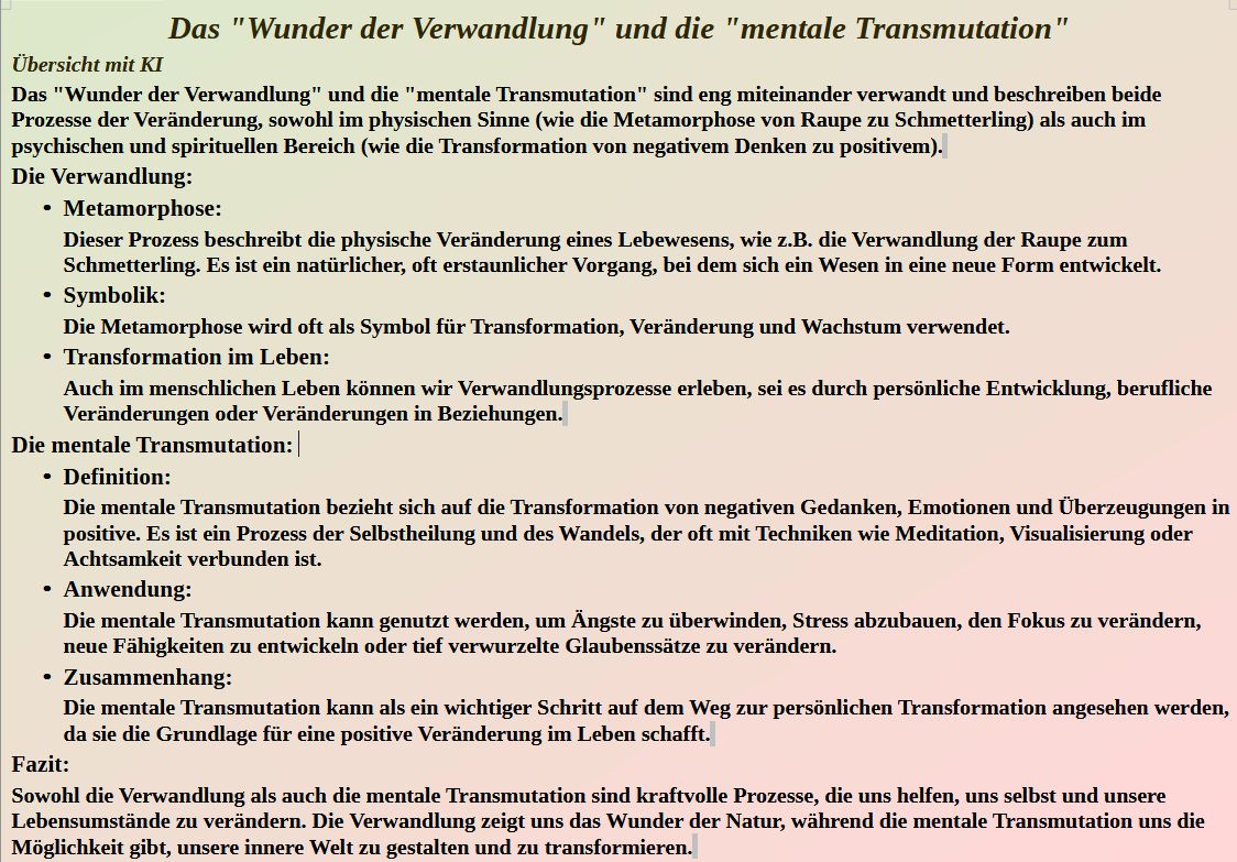 Verwandlungswunder Quelle der Infos: telegram/Links/YT schuld & vergebung – Google Das Wunder der Verwandlung oder die mentale Transmutation Das Wunder der Verwandlung oder die mentale Transmutation – Auszug aus „Der echte Da Vinci Code“ von Jean Bauer – Amazon – Seite 285-295