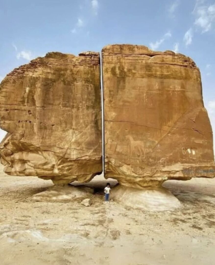 Man schätzt, dass der Felsen über 4.000 Jahre alt ist. Ob durch tektonische Bewegungen, Erosion oder geologische Brüche – niemand kann mit Sicherheit sagen, wie genau dieser Schnitt entstanden ist. Noch faszinierender: Beide Hälften stehen stabil auf eigenen, schmalen Sockeln, als würden sie jeden Moment kippen – und doch verharren sie unbeweglich, Jahrtausend um Jahrtausend. Ein stilles Rätsel mitten in der Wüste.